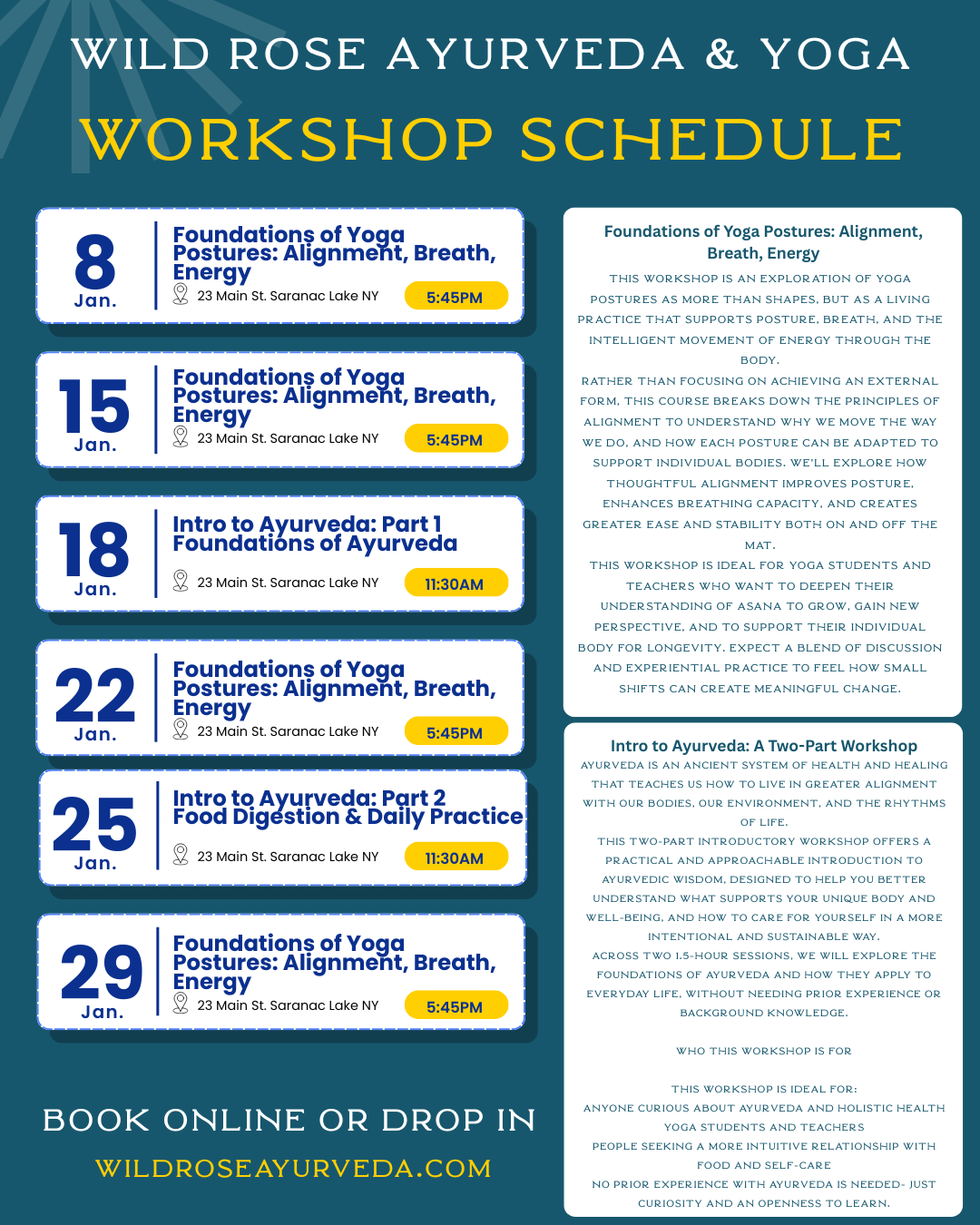 Join us on Jan 17, 2026 to celebrate the 1-year anniversary of the Wild Rose Ayurveda & Yoga Studio in Saranac Lake. There will Be Free Yoga, Free Breathwork Session, and a Mala Bead Making Workshop!